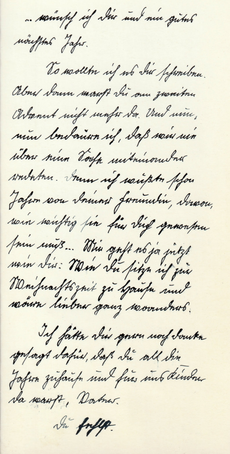 Text von der Karte: «… wünsch ich Dir und ein gutes nächstes Jahr. So wollte ich es Dir schreiben. Aber dann warst Du am zweiten Advent nicht mehr da. Und nun, nun bedaure ich, daß wir nie über eine Sache redeten. Denn ich wußte schon Jahre von Deiner Freundin, davon, wie wichtig sie für Dich gewesen sein muß … Mir geht es ja jetzt wie Dir: Wie Du sitze ich zur Weihnachtszeit zu Hause und wäre lieber ganz woanders. Ich hätte Dir gern noch Danke gesagt dafür, daß Du all die Jahre zuhause und für und Kinder da warst, Vater. Du fehlst.«