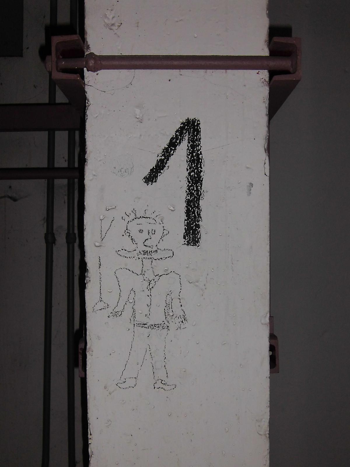 Putzmalerei eines unbekannten Künstlers (Künstler 1), wahrscheinlich mehrere Jahre alt. Es wird vielleicht vom einen oder anderen Besucher der Ausstellung übersehen werden. Blei- oder Kopierstift auf Fassadenfarbe.