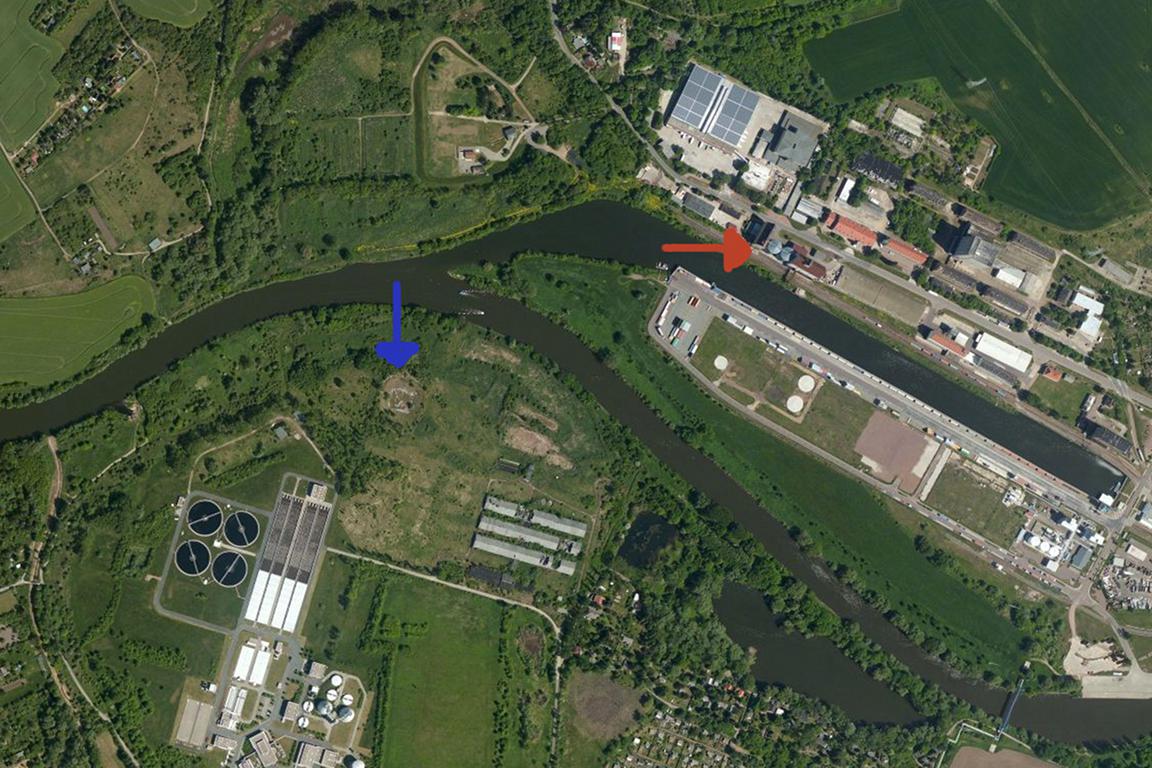 Ich stand an der Spitze des blauen Pfeiles. Die Gebäude im Bild sind durch den roten Pfeil gekennzeichnet.