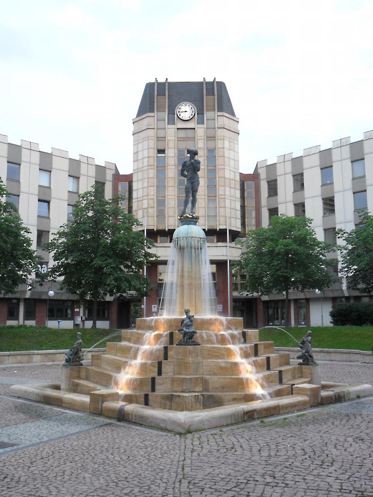 Der Brunnen steht vor dem (ehemaligen) Rathaus der Chemiearbeiterstadt Halle-Neustadt. Heutzutage sitzt irgendeine Landesbehörde im Gebäde.